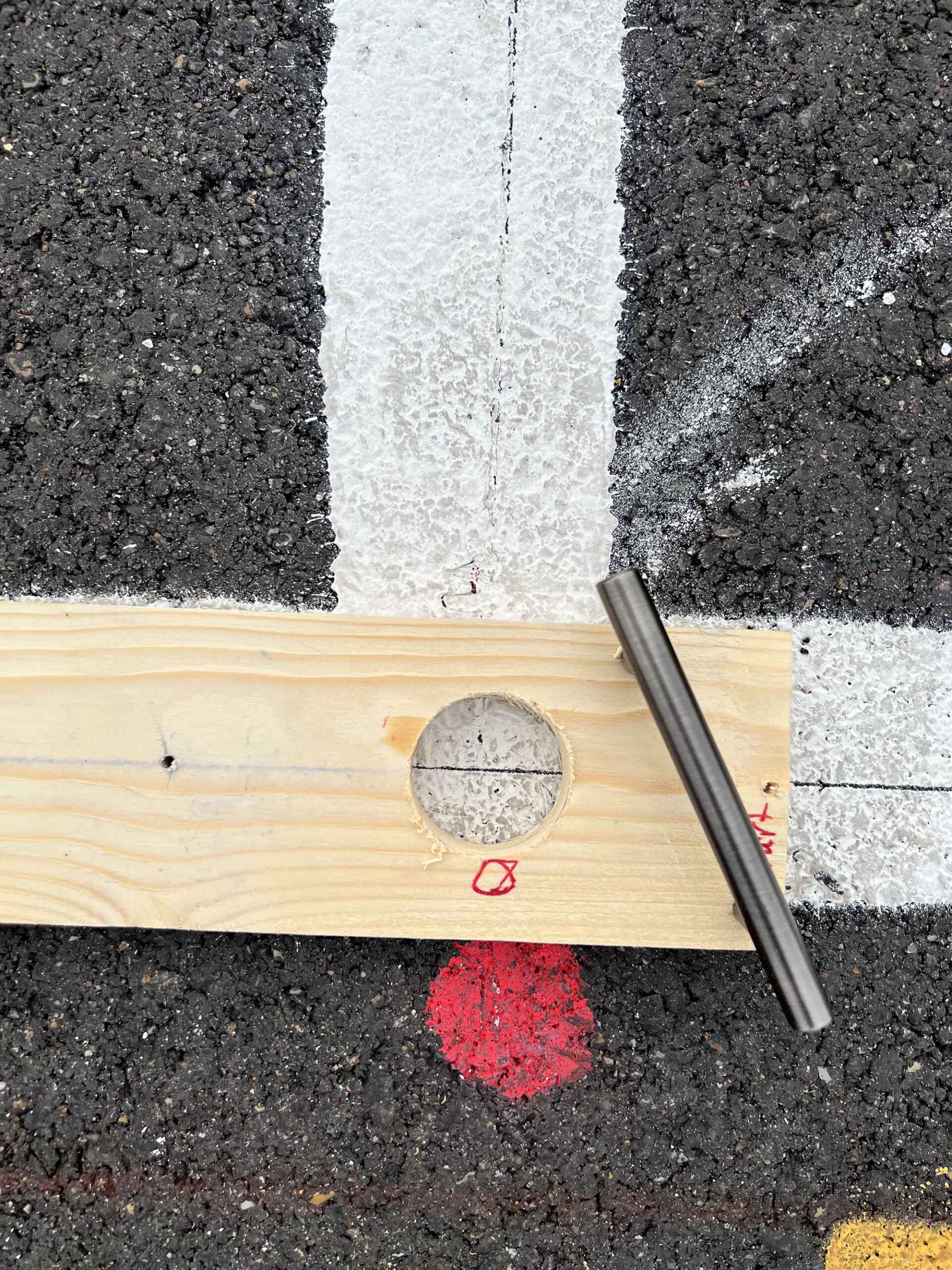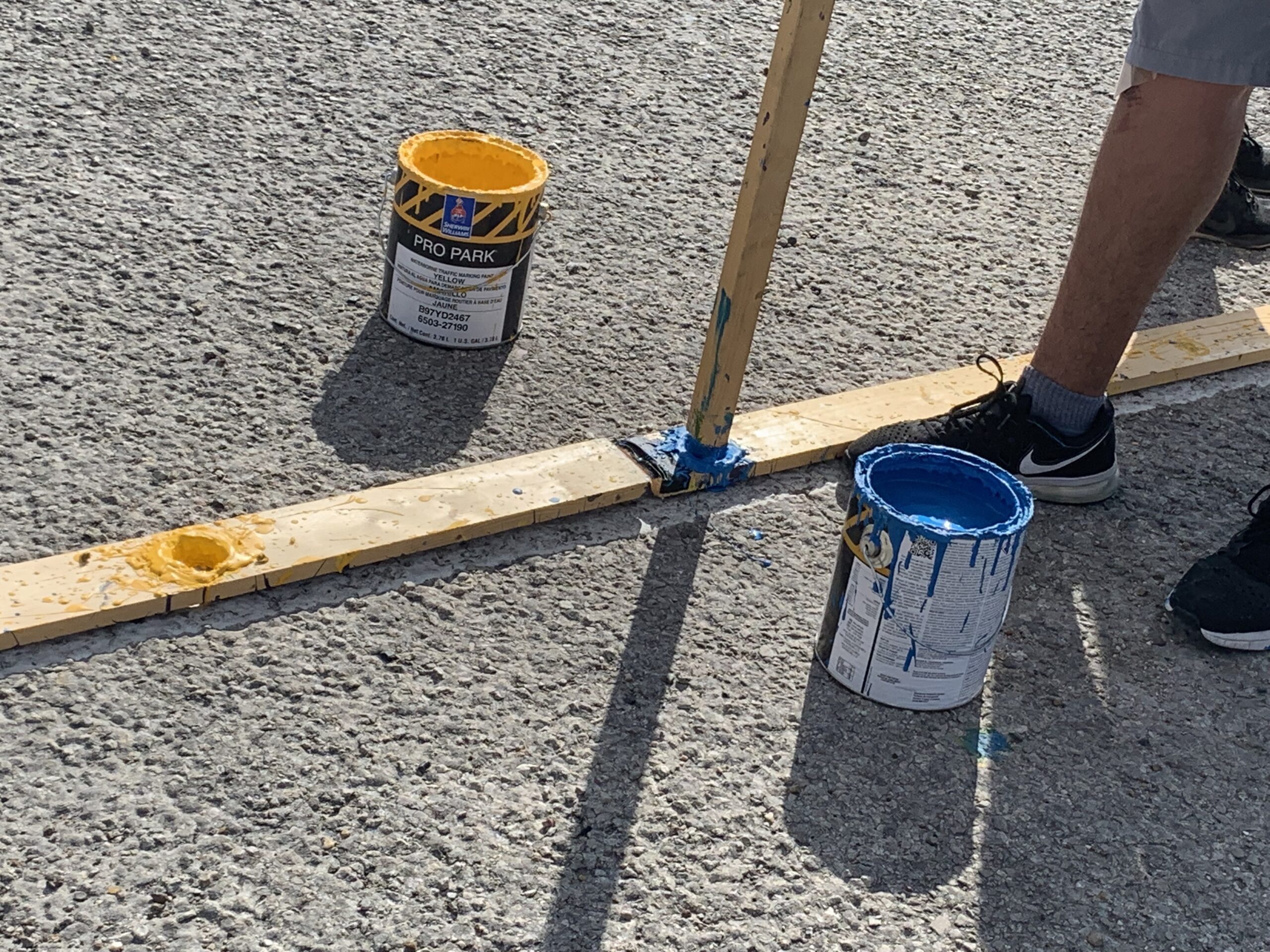 One other approach I’ve had a lot of success with lets you use more students and move quicker. Make more of the templates, and then purchase 1×1 boards. I use gaffing tape to make a handle on them, and then on the other end cut circles out of foam paint brushes. They then become long paint brushes that you dip in paint, twist in the template hole, and then keep moving. This is the faster method since you can get a few boards and crews going and cover a lot more ground! On the one below I think I had 2x2s or the wrong side circle cutter and had to trim down the end of the board there.